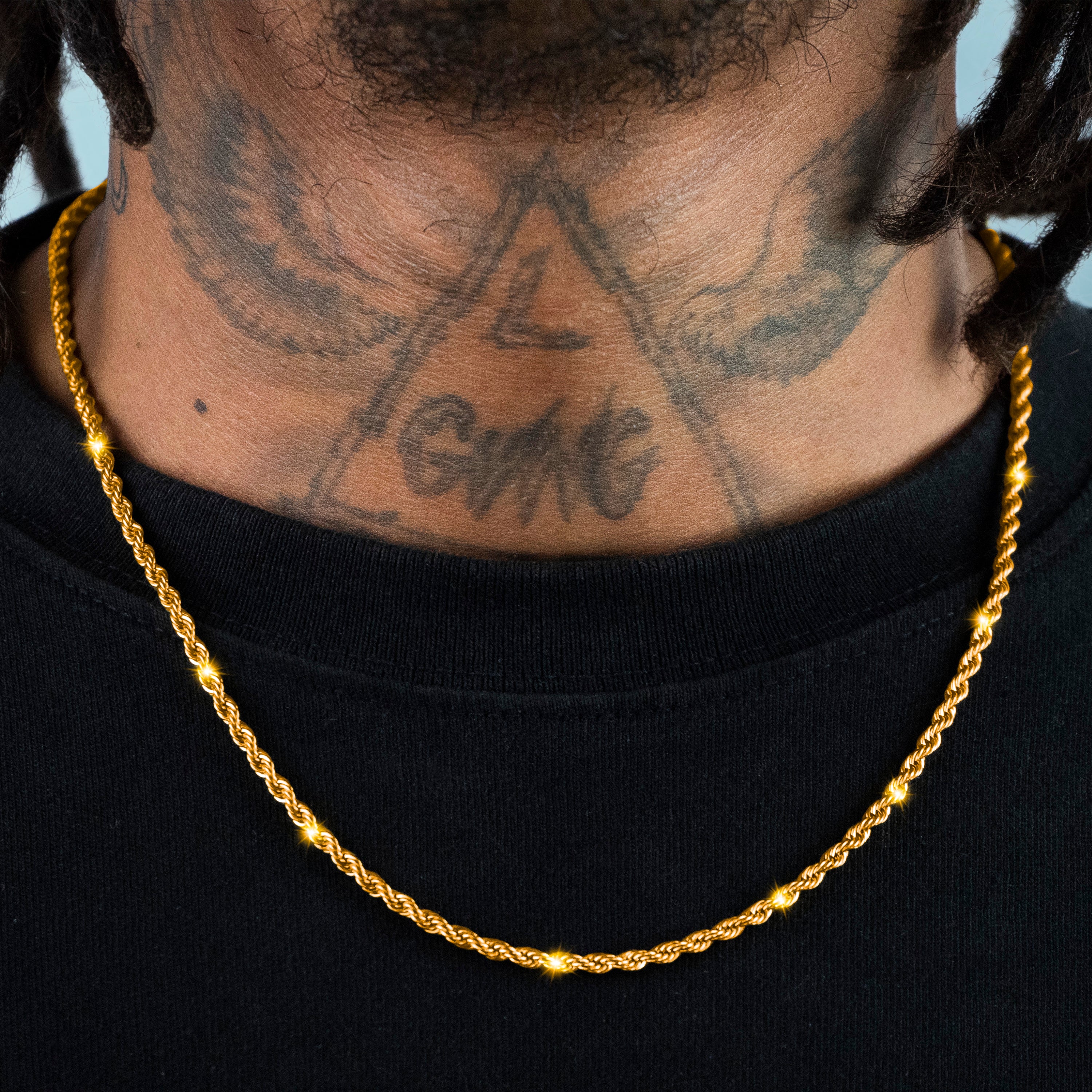 La Cadena Rope 4 mm Oro 18K ofrece un diseño clásico con grosor medio. Una opción sólida para uso diario, con brillo dorado y buena presencia.