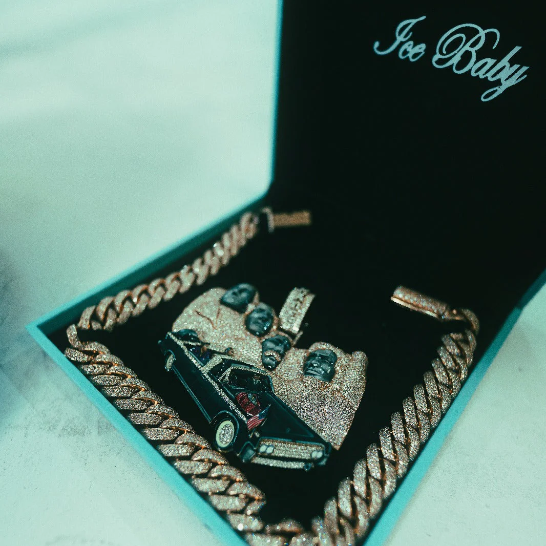 En colaboración con Hades66, su colgante inspirado en el Monte Rushmore, símbolo de dinero en abunadncia, lleva la historia a otro nivel con el detalle de Kennedy en el coche y Hades66 en la parte trasera, una referencia directa a la calle y al movimiento que domina el juego.