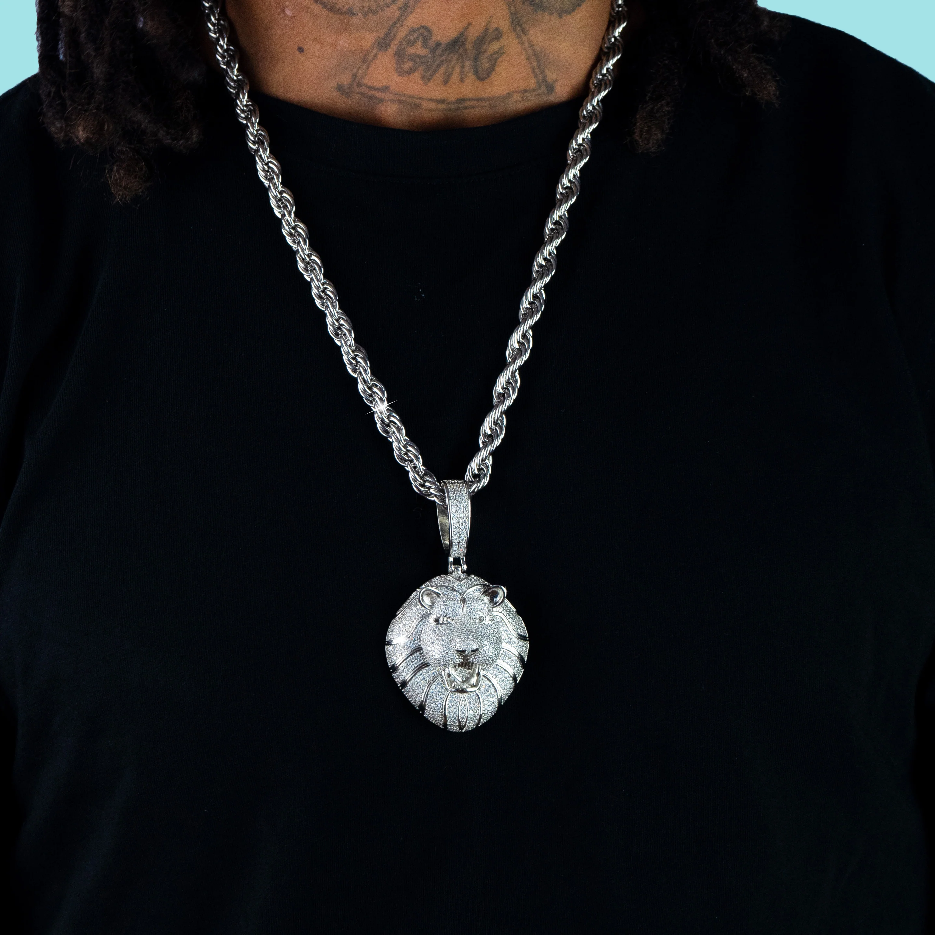 El Colgante León Oro Blanco mantiene la misma energía salvaje con un acabado helado. Para quienes mandan con calma y control.