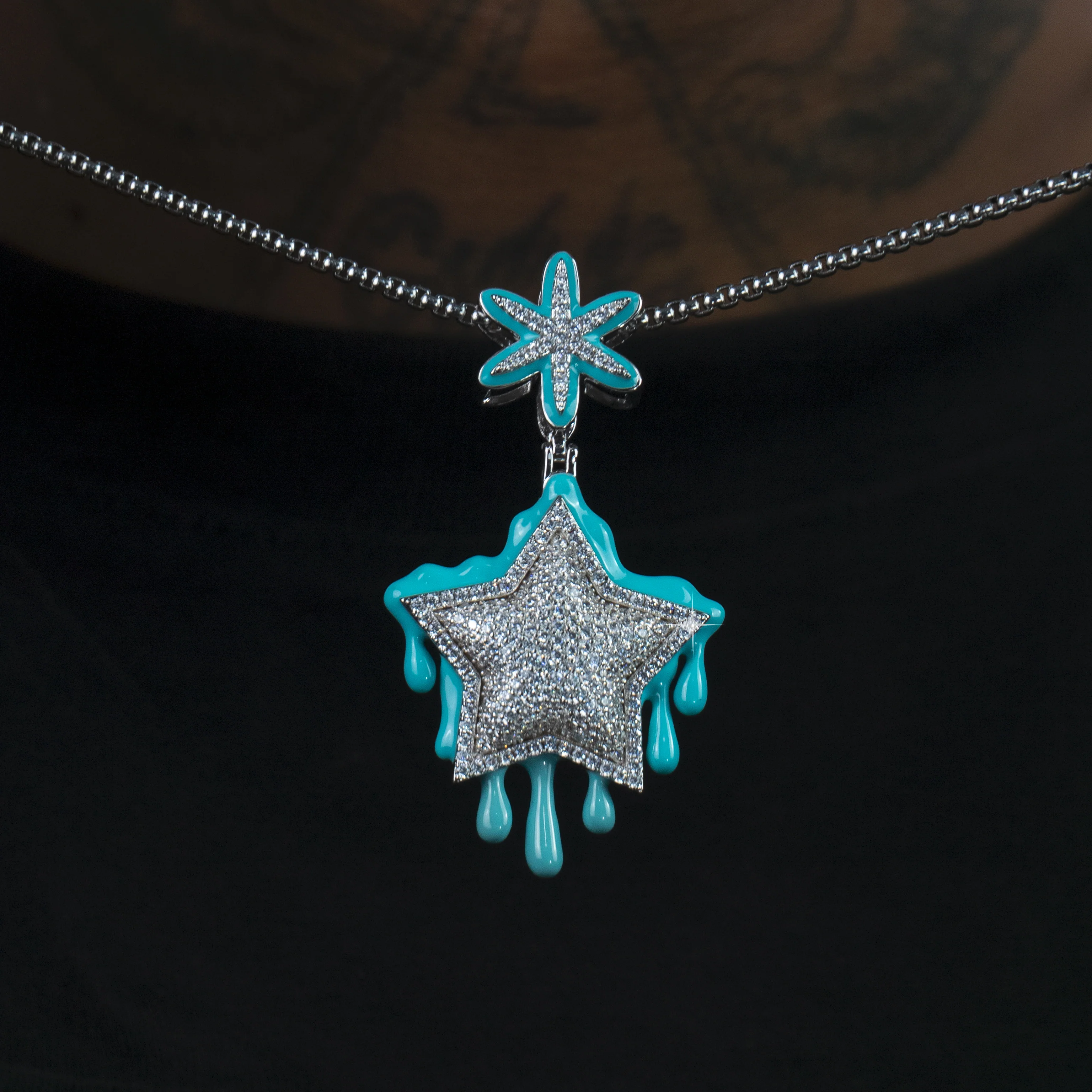 El Colgante Luminoso Dripping Star Oro Blanco tiene ice completo y efecto glow. Una joya única que llama la atención tanto de día como de noche.