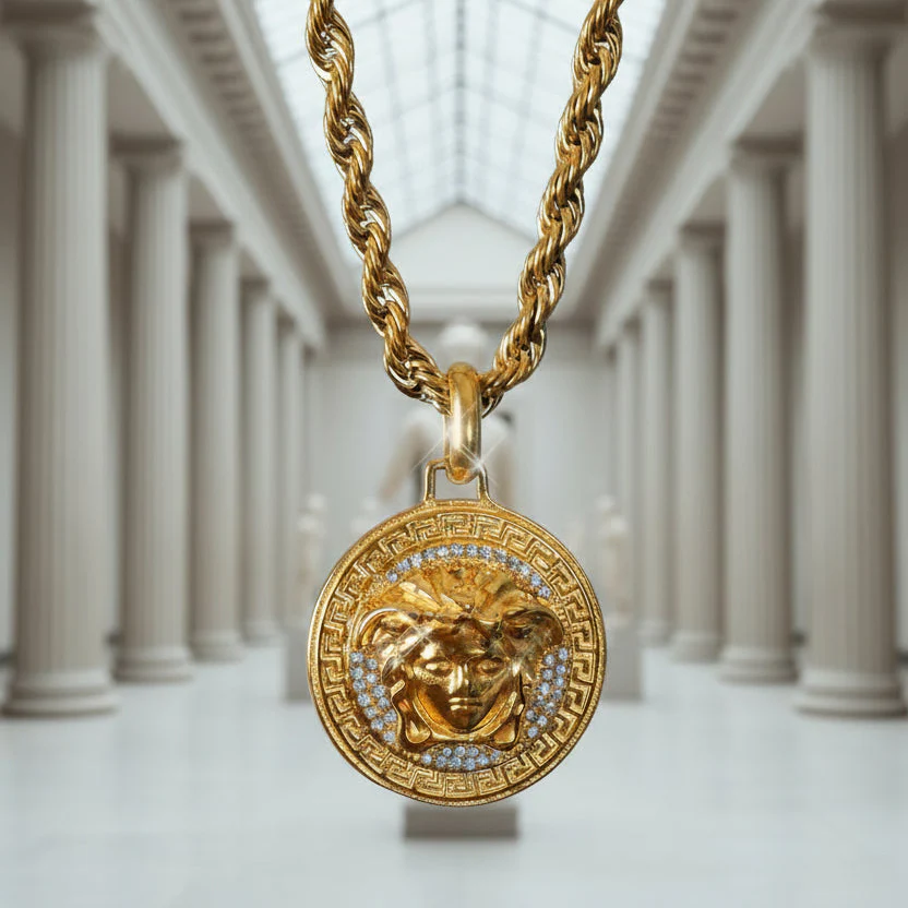 El Colgante Medusa Ice Oro 18K combina mitología y ice. La cabeza de Medusa cubierta de circonitas transmite protección, respeto y fuerza visual.