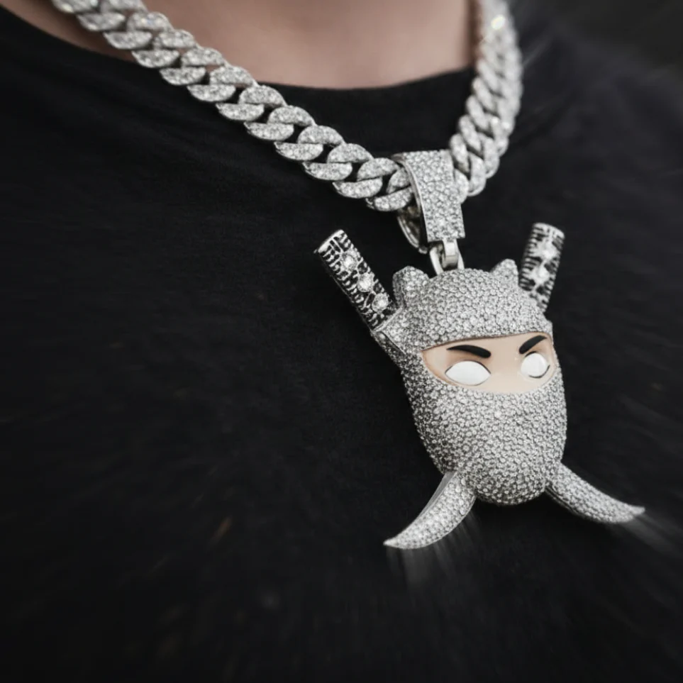 El Colgante Ninja Edición Limitada Oro Blanco es la versión accesible de una de las piezas más icónicas del trap: el Ninja de Yovngchimi, que costó más de 100.000 $. Esta joya edición limitada no es para cualquiera. Tiene un diseño brutal y detallado, y lo más salvaje: puedes sacar las espadas afiladas. Poder, oscuridad y respeto callejero concentrados en una sola pieza. Si vas a usarlo… hazlo con cuidado.