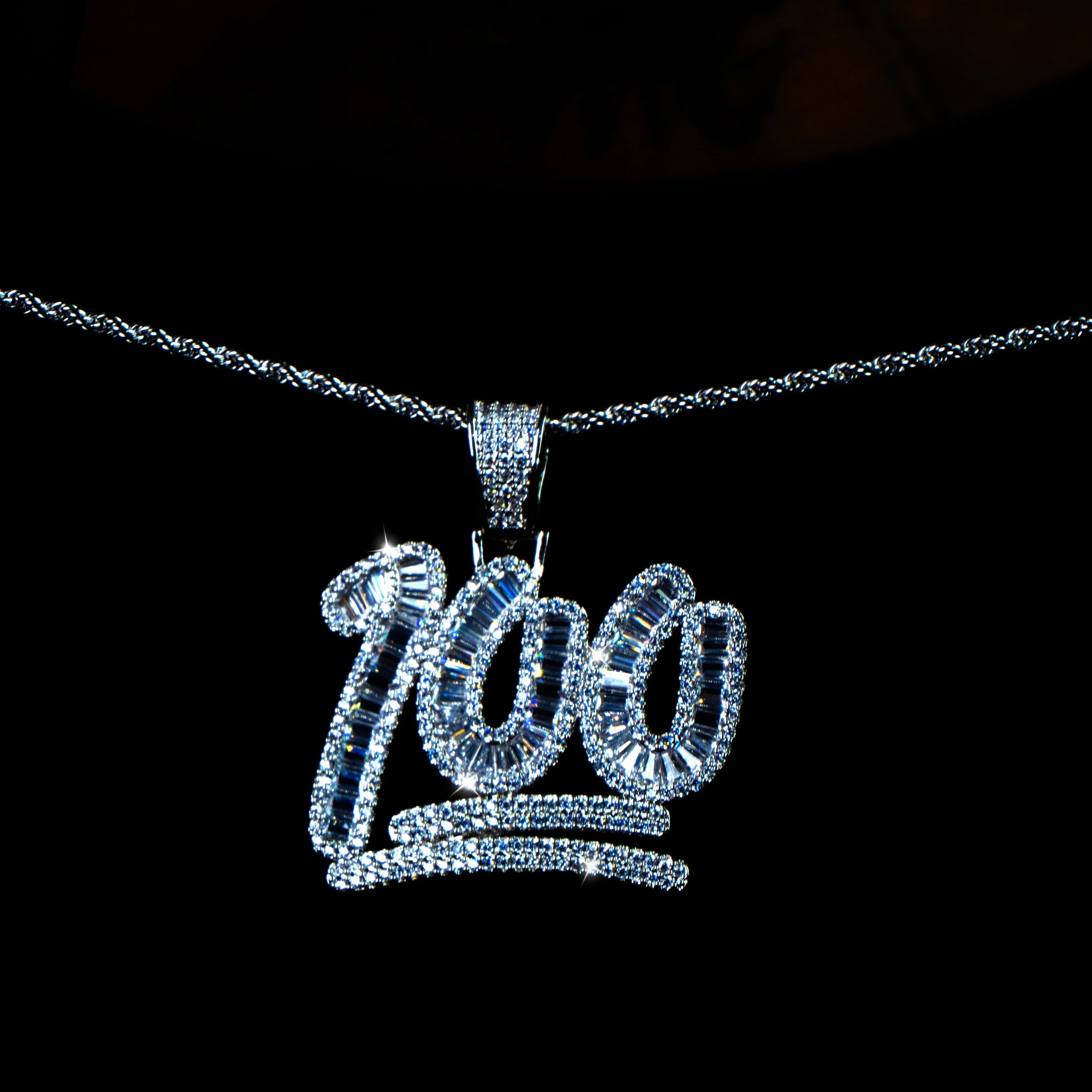 La versión helada del “100”. El Colgante 100 Baguettes Oro Blanco está cubierto de ice en corte baguette. Frío, preciso y directo.
