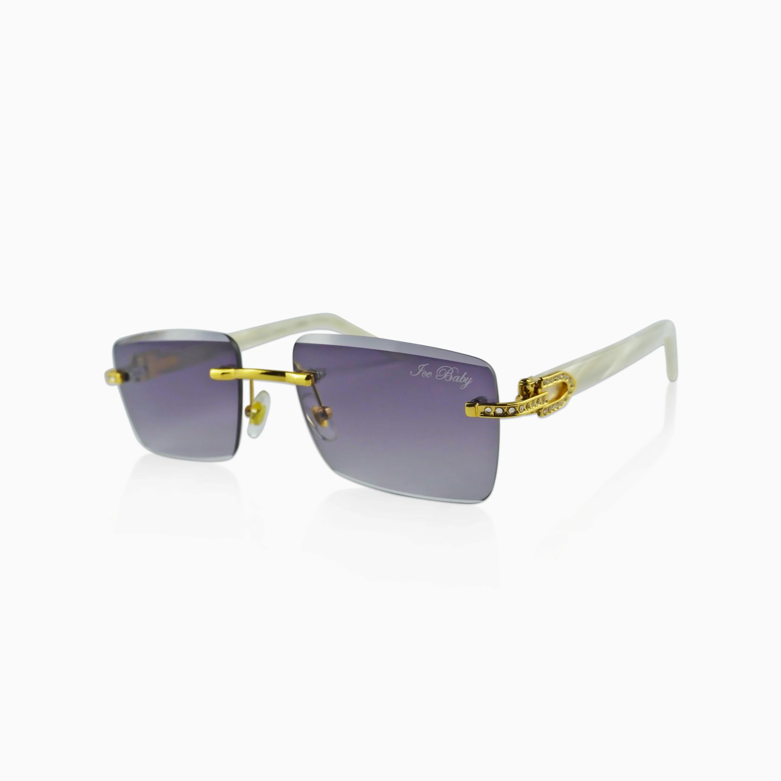 Un modelo elegante y diferente, con montura blanca efecto nácar y detalles dorados con circonitas 5A que brillan con cada movimiento. Lente negra semitransparente con protección UV para máxima seguridad sin perder estilo.