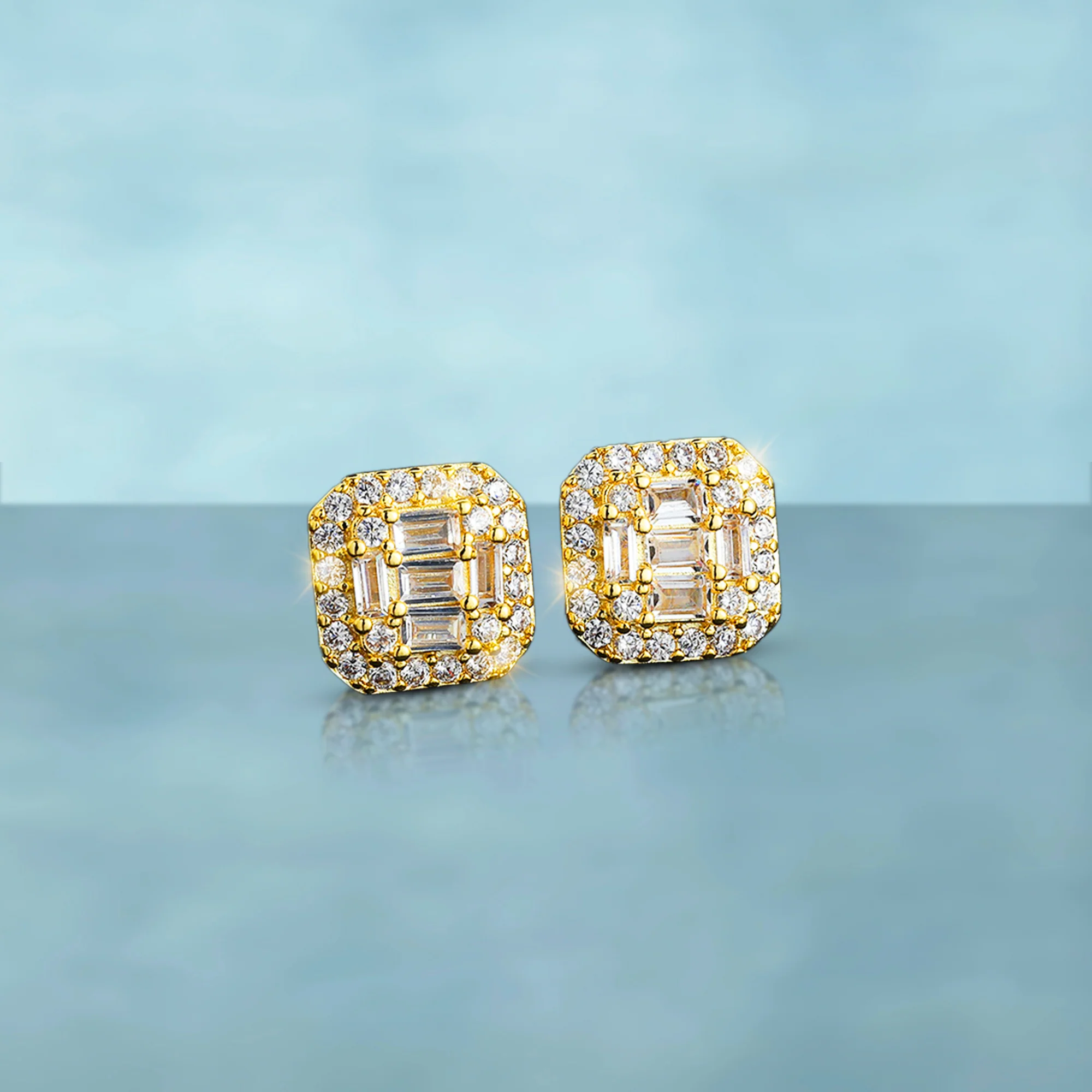 Piedras baguette alineadas con precisión. Modelo deluxe full iced montado en plata 925 bañada en oro 18K. Pura presencia con acabado limpio.