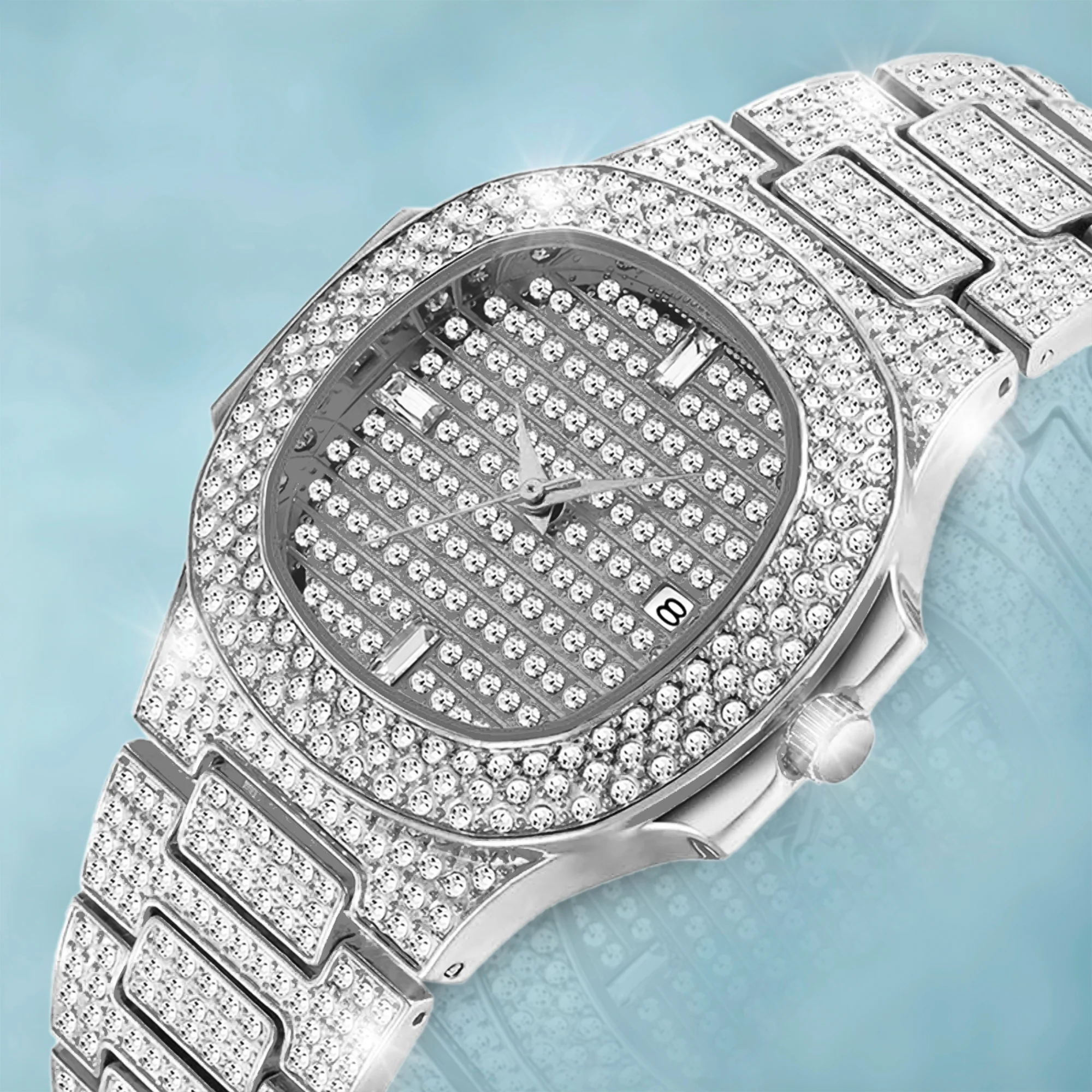 Estilo tipo Nautilus en acero inoxidable, bañado en oro blanco completamente cubierto de circonitas. Diseño futurista, limpio y elegante.