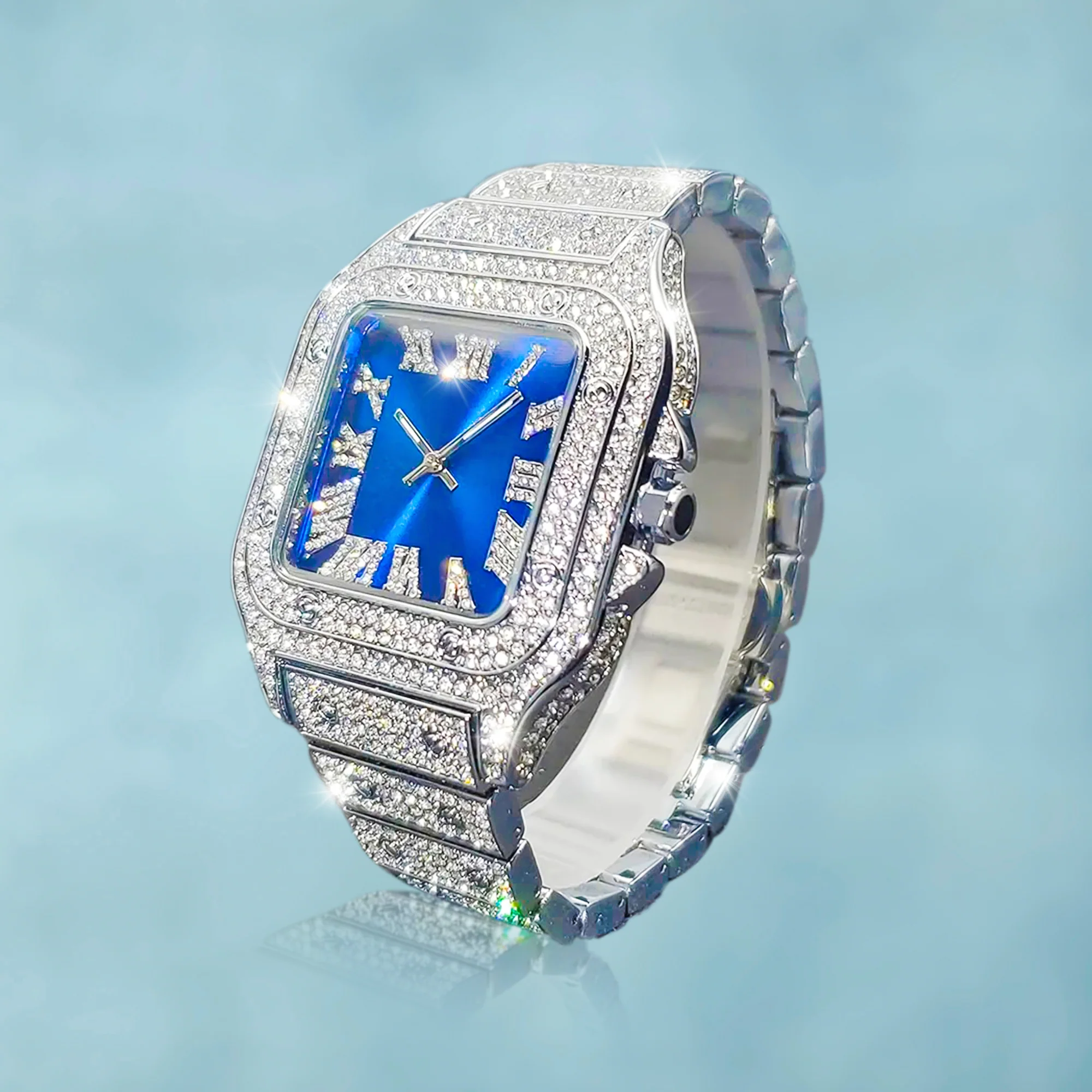 Edición clásica con esfera azul eléctrica que no pasa desapercibida. Totalmente bañado en oro blanco y circonitas 5A, con numeración romana. Fabricado en acero inoxidable.